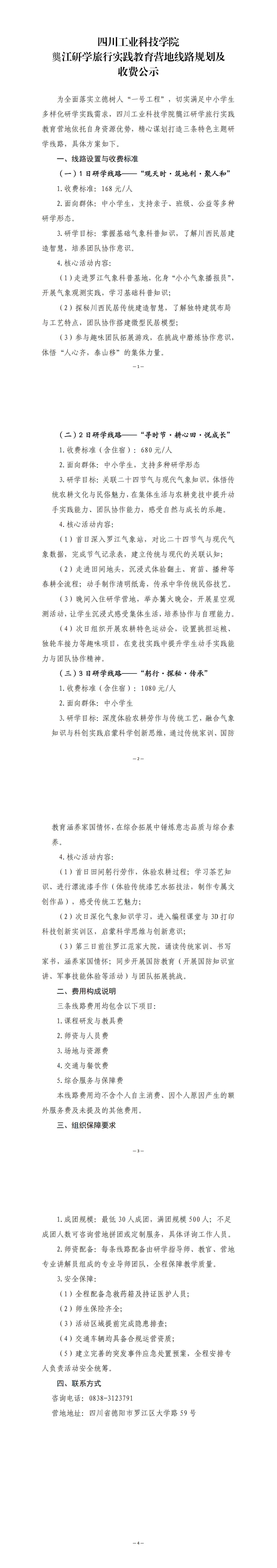 四川工业科技学院龑江研学旅行实践教育营地线路规划及收费公示