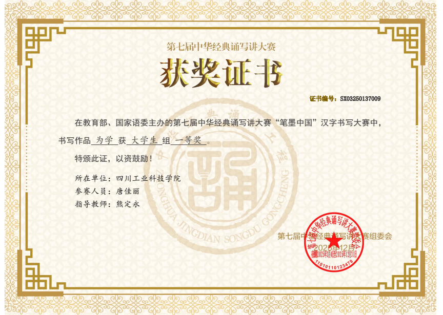 近日,教育部、国家语委主办的第七届中华经典诵写讲大赛,以及四川省2025年中华经典诵写讲演系列活动获奖名单相继公布。学校师生在两项赛事中表现优异,共获国家级一等奖1项、三等奖1项,省级一等奖1项、二等奖1项、三等奖4项、优秀奖7项,充分展现了学校在中华优秀传统文化教育与语言文字工作方面的扎实成效。