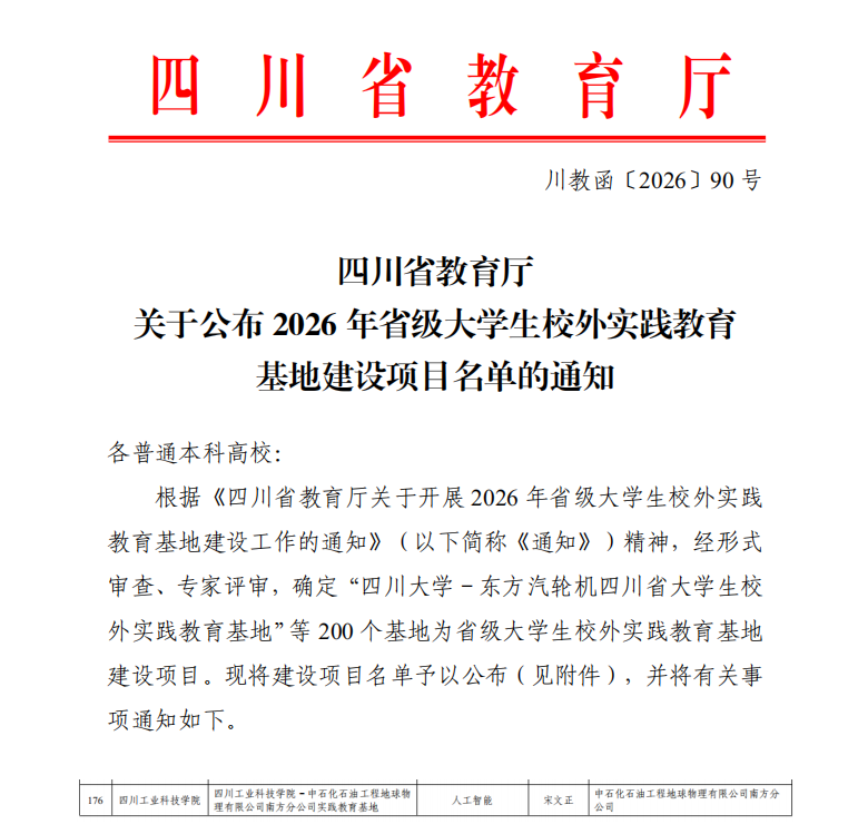近日,四川省教育厅发布《关于公布2026年省级大学生校外实践教育基地建设项目名单的通知》(川教函〔2026〕90号),信息工程学院申报的“四川工业科技学院-中石化石油工程地球物理有限公司南方分公司实践教育基地”成功获批省级大学生校外实践教育基地建设项目。这标志着学院在校企协同育人、产教融合方面取得重要突破。