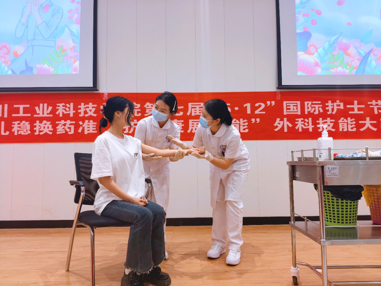 为传承南丁格尔精神,弘扬“敬佑生命、救死扶伤、甘于奉献、大爱无疆”的职业风尚,4月22日晚,大健康学院在龑江B区报告厅举行“包扎稳换药准·护安康展技能”外科技能大赛决赛。学院副院长刘琼碧、专业教师林艳、王玉香、刘盛露、刘小琴、唐婷担任评委,徐铭泽同学担任主持人。