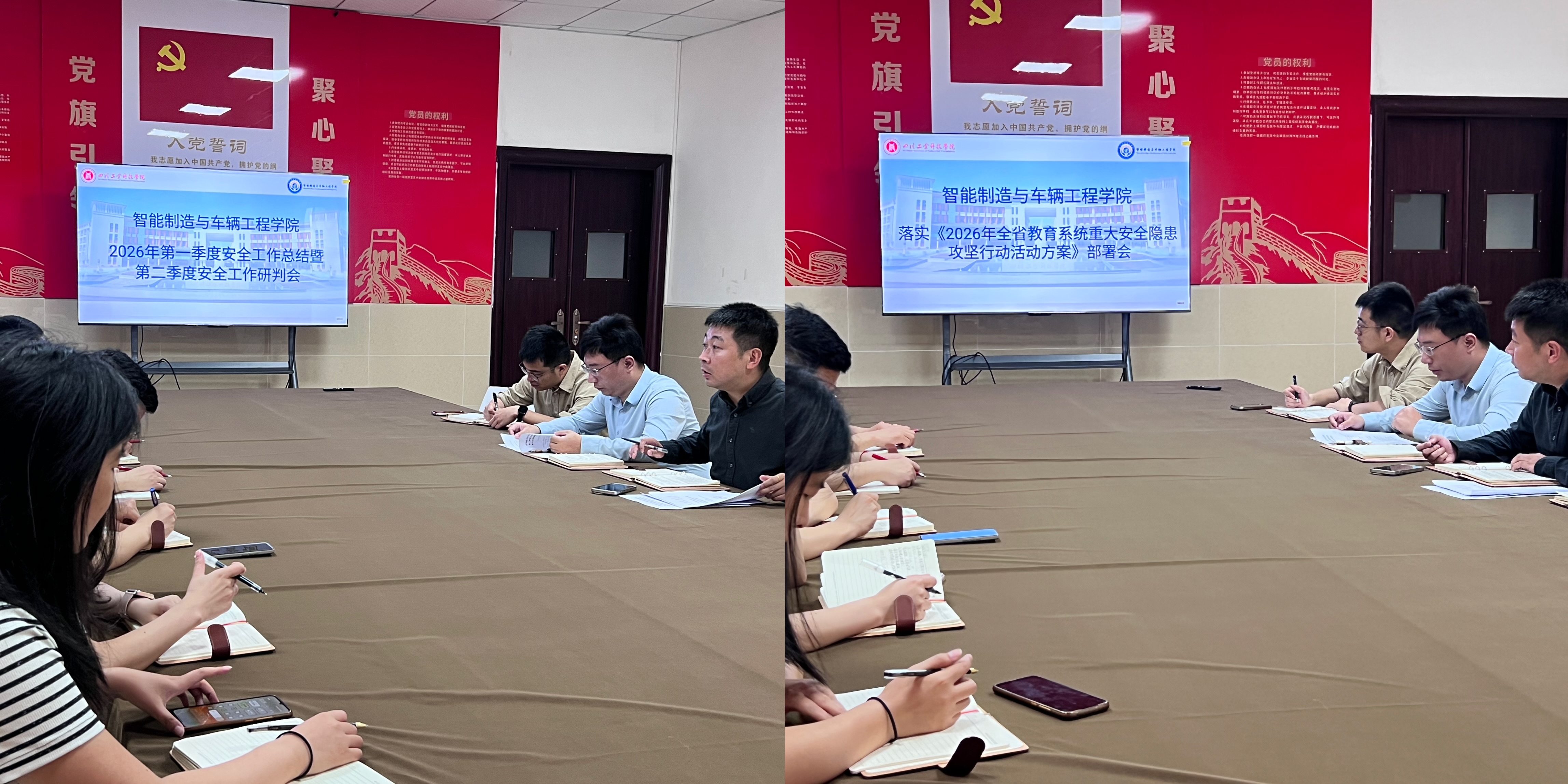 4月26日上午,智能制造与车辆工程学院在龑江校区E511会议室召开2026年第一季度安全工作总结暨第二季度安全形势研判会,传达落实全省教育系统重大安全隐患攻坚行动部署要求。学院科级以上干部参加会议。