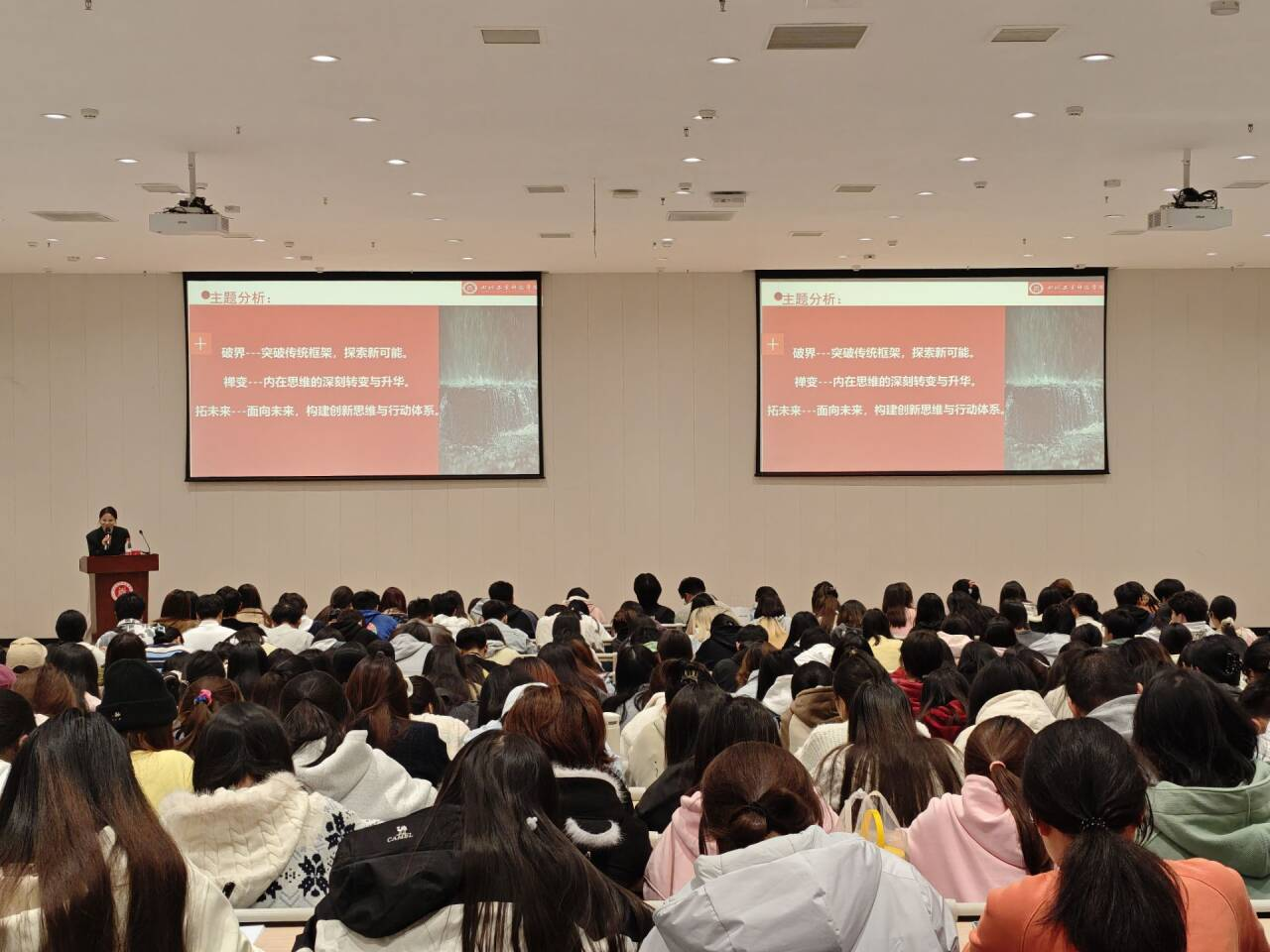 本学期,为深入推进专创融合教育,激发学生创新思维,创新创业学院策划举办系列专创融合主题学术活动,特邀多位校内学科专家与双创导师担任主讲。本次讲座启动报名后,迅速吸引全校上千名不同专业学生踊跃参与,现场座无虚席,气氛热烈。江晓燕教授以李白《将进酒》为引,围绕“破界”主题,强调打破传统思维框架、勇于探索未知领域的重要性。在“蝉变”环节,她聚焦思维模式的深层转变,系统阐释从“流量思维”转向“价值思维”的逻辑路径,实现价值观引导与专业教育的有机融合。谈及“拓未来”时,江晓燕教授鼓励学生立足专业基础,将思政教育中蕴含的家国情怀转化为创新实践的内生动力,在创业过程中积极回应社会关切、服务国家发展。