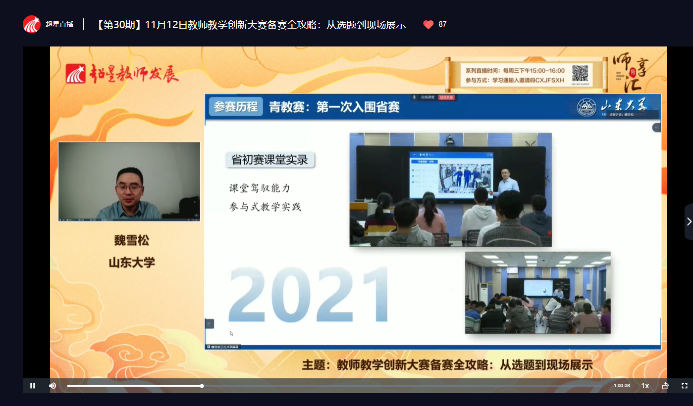 本期讲座特邀山东大学魏雪松副教授担任主讲嘉宾。魏雪松副教授结合自身丰富的教学实践与大赛评审经验,以《教师教学创新大赛备赛全攻略:从选题到现场展示》为题,为在线教师带来了一场内容翔实、针对性强的精彩分享。讲座围绕教学创新大赛的核心要求,系统梳理了从精准选题、教学设计创新、课程资源整合,到现场汇报展示与答辩技巧等各备赛关键环节。魏教授通过解析大量优秀获奖案例,深入浅出地阐述了如何凝练教学创新点、如何有效呈现教学改革成效,为教师们提供了清晰实用的备赛路径与策略指导。
