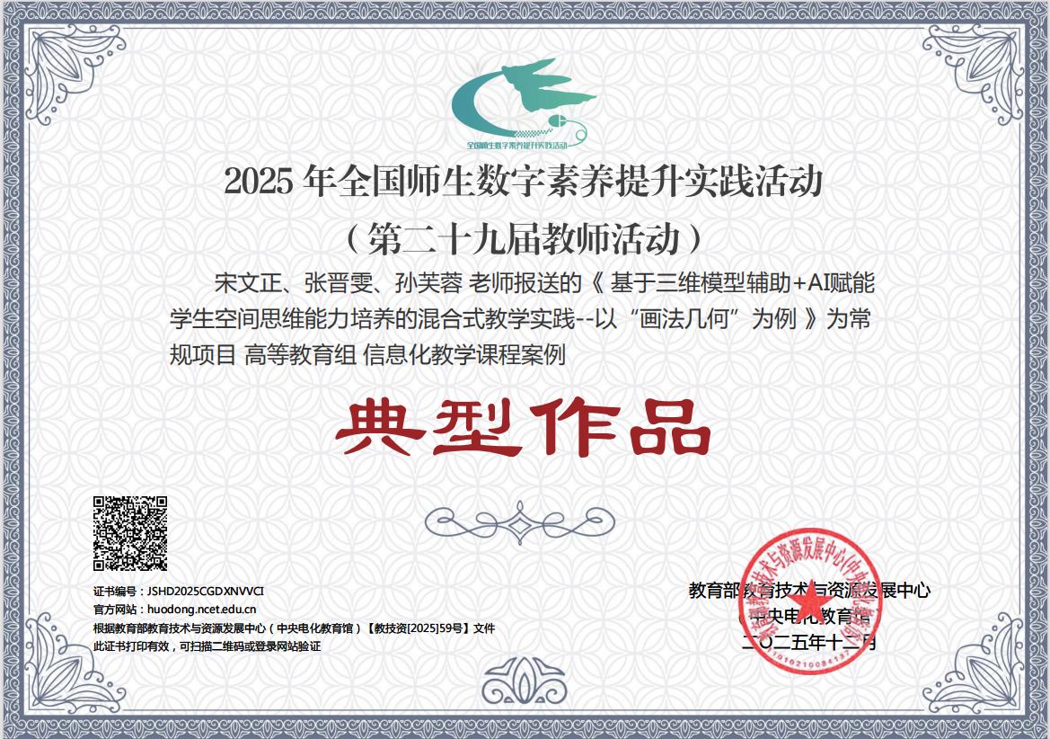 近日,教育部教育技术与资源发展中心(中央电化教育馆)公布2025年全国师生数字素养提升实践活动评审结果,学院宋文正、张晋雯、孙芙蓉三位教师合作完成的信息化教学课程案例《基于三维模型辅助+AI赋能学生空间思维能力培养的混合式教学实践——以“画法几何”为例》,在高等教育组评选中脱颖而出,获评“常规项目典型作品”。