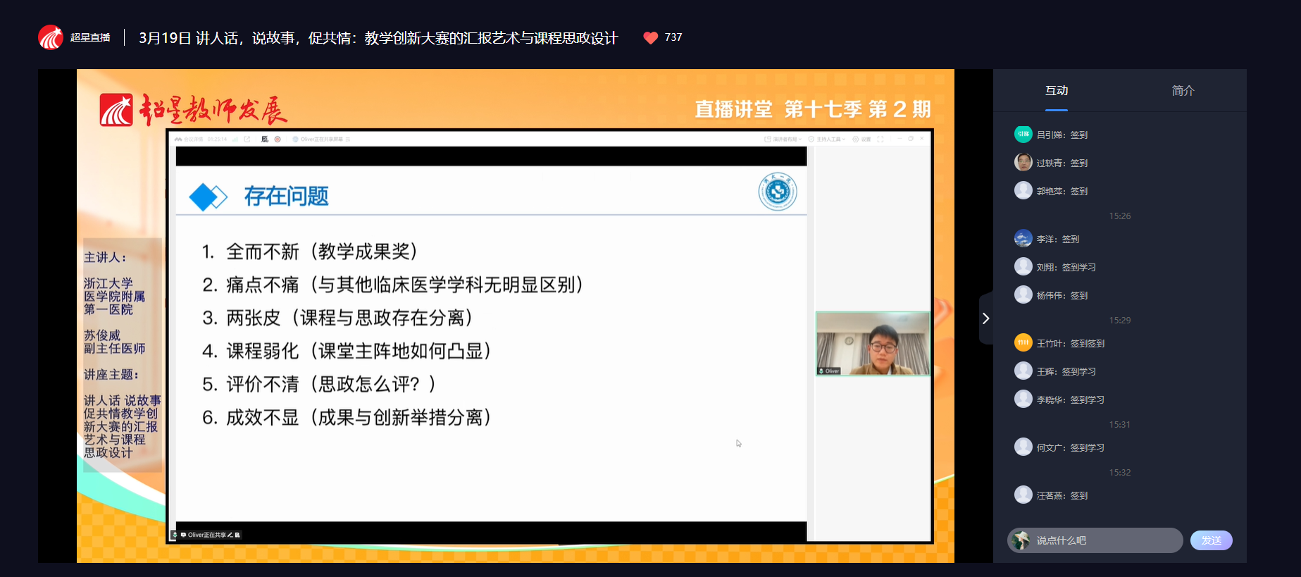 3月19日下午,学校教师教学发展中心组织全校无课教师在线收看超星教师发展直播讲堂第17季第2期讲座。本期特邀浙江大学医学院附属第一医院感染病科副主任医师苏俊威担任主讲,他以“讲人话说故事促共情——教学创新大赛的汇报艺术与课程思政设计”为题,为全校教师带来一场兼具理论深度与实践指导的教学分享。