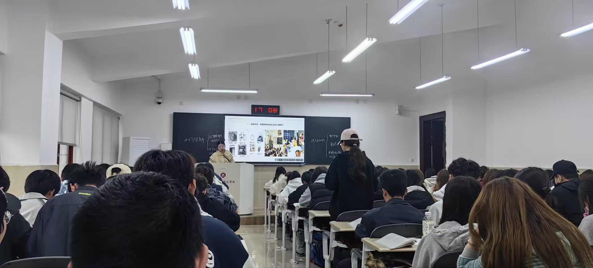 针对本学期教研活动时间与部分教师授课时间相冲突的实际情况,教研室创新采用“无课教师集体走进有课教师课堂”的新形式,集体观摩王婷老师的课堂教学展示。活动由教研室主任江春雷主持,马克思主义学院院长毛晓红出席,全体无课教师参加。