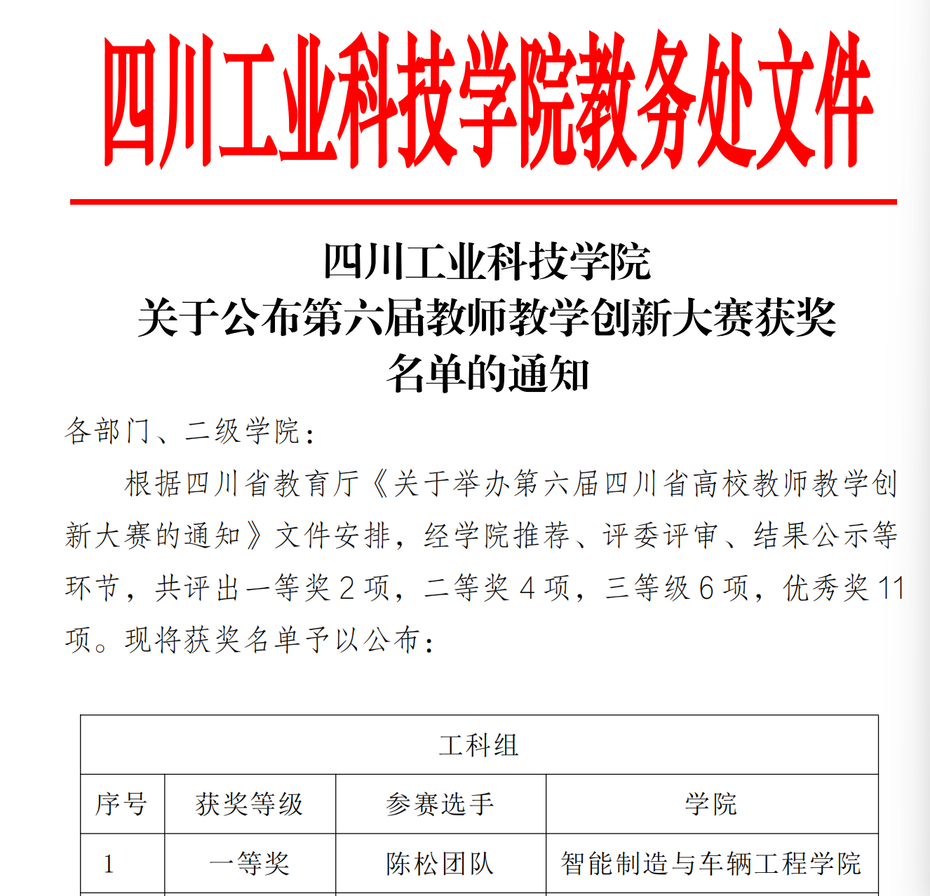 近日,学校第六届教师教学创新大赛获奖名单正式公布。本次大赛根据四川省教育厅《关于举办第六届四川省高校教师教学创新大赛的通知》要求,经学院推荐、评委评审、结果公示等环节,共评选出一等奖2项、二等奖4项、三等奖6项、优秀奖11项。