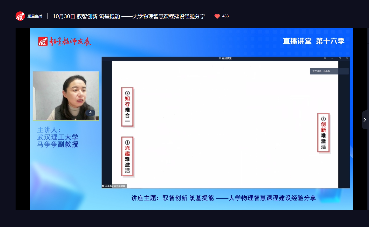 本期直播讲堂特邀武汉理工大学马争争副教授担任主讲嘉宾。马争争教授以《驭智创新 筑基提能——大学物理智慧课程建设经验分享》为题,为学校教师带来了一场内容丰富、见解独到的学术报告。报告中,马争争结合自身在武汉理工大学开展大学物理智慧课程建设的实践与探索,系统分享了如何有效利用现代信息技术手段,如超星学习平台等,进行课程内容重构、教学模式创新、评价体系改革以及教学资源建设。他详细阐述了如何通过智慧课程建设“驾驭”智能技术以激发教学创新活力,如何“夯实”学生能力基础,并最终实现教学效能和人才培养质量的“提升”。马教授的分享既有高屋建瓴的理论指导,又有具体而微的实操案例,为一线教师开展智慧教学提供了宝贵的经验和清晰的路径。