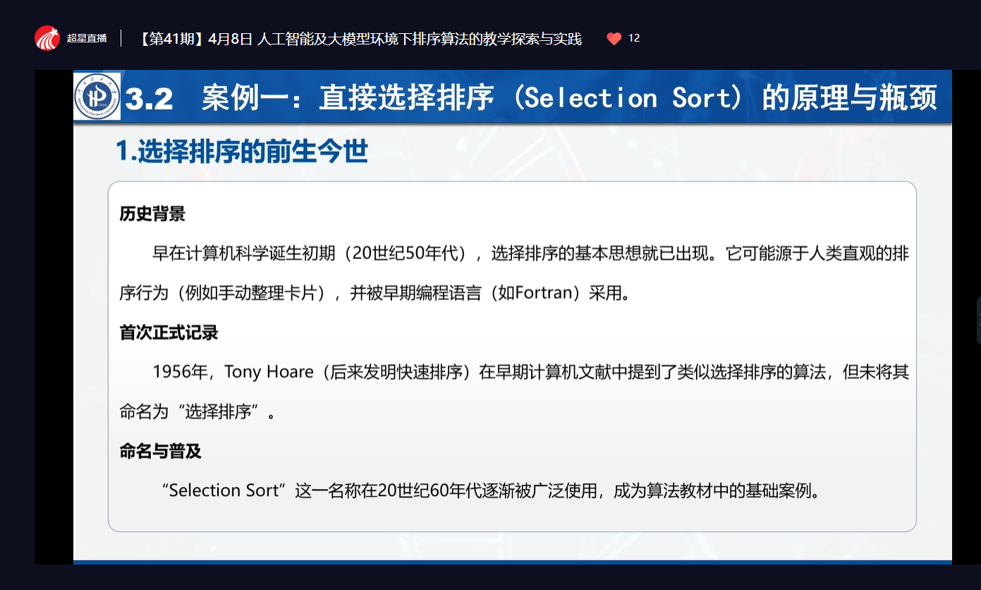 在实践层面,王建芳分享了“问题驱动+案例引导+人机协同”的教学改革路径。通过引入真实场景中的排序问题,结合大模型生成对比案例,引导学生辨析不同算法的适用条件与效率差异,并借助智能工具完成代码调试与优化报告。他还展示了部分课堂互动与作业设计的创新做法,强调培养学生计算思维与批判性使用AI工具的能力。