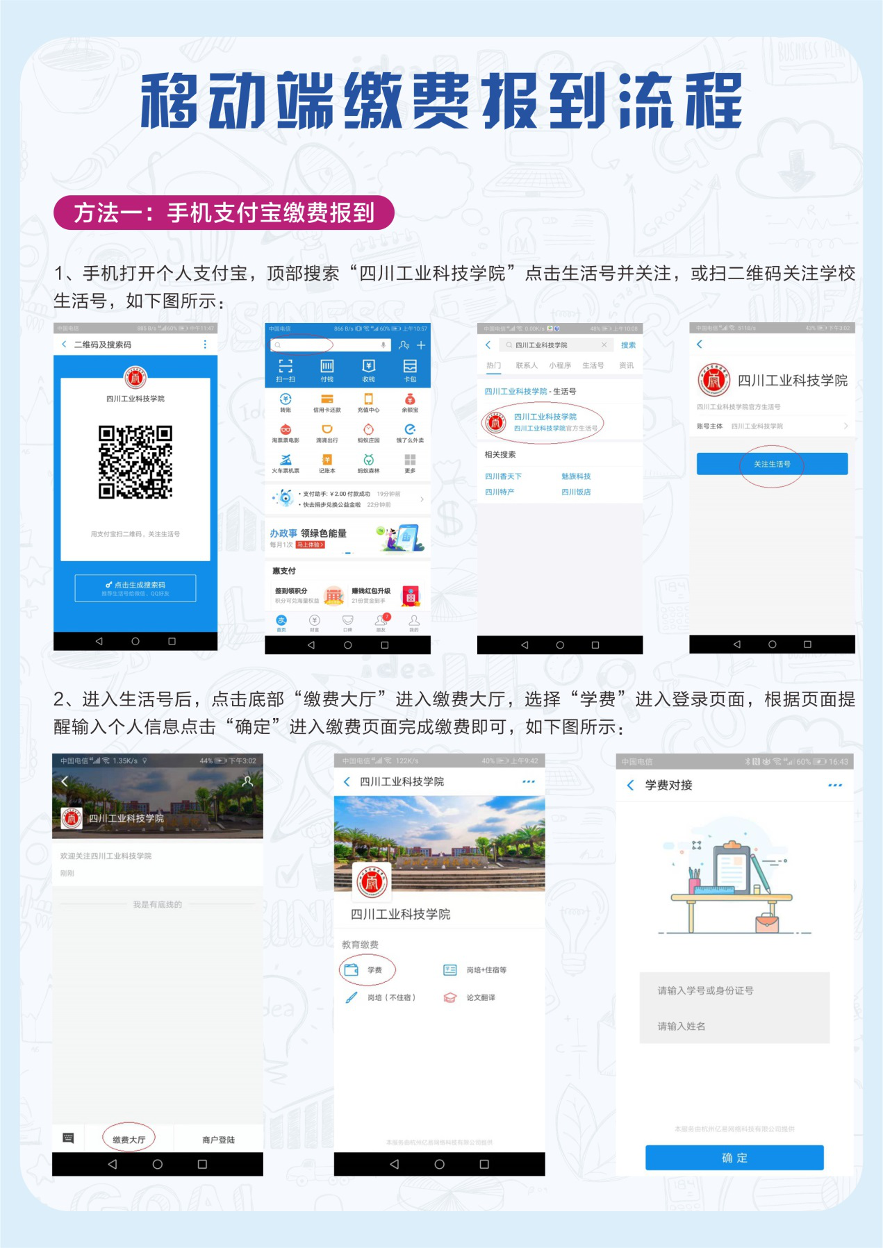 2.进入“四川工业科技学院”生活号后,点击底部“缴费大厅”,选择选择“学费”进入登录页面,根据页面提醒,输入本人身份证号码和姓名,点击“确定”进入缴费页面完成缴费即可。(详见文末流程图)