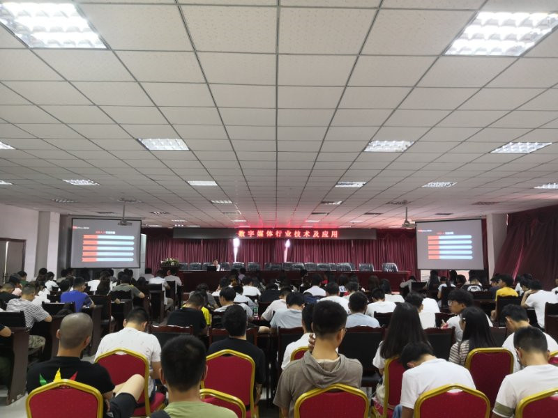 陈校莹首先对自己的工作经历进行了简单的介绍,并用一个简短的视频详细介绍了数字媒体的独特魅力,希望同学们能够从中更加直观的了解到数字媒体这个行业并且感受到这个职业的美。随后她对容艺传媒公司的部分已出产、处于研发段的产品和工作环境进行了展示,为同学们深度剖析了对新引进人员培养的要求及薪资待遇,并热情邀请同学们到公司参观和学习。
