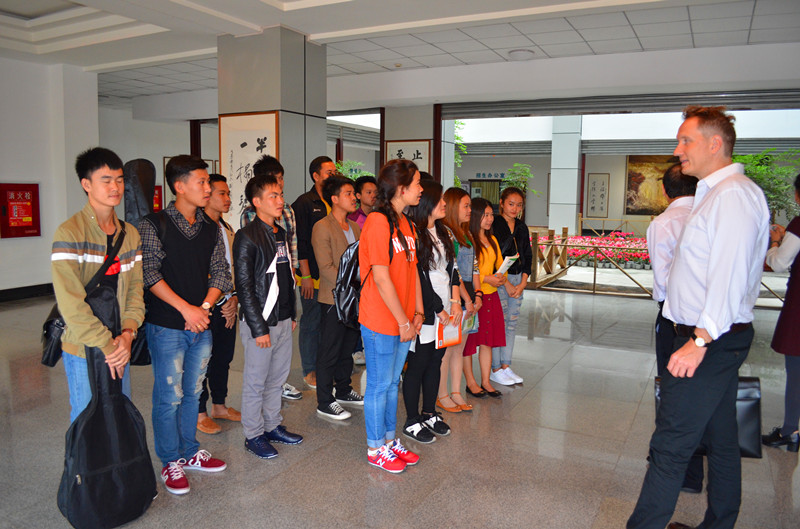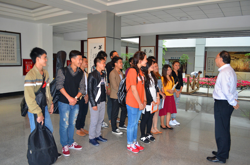 10月21日下午,执行校长唐健禾教授陪同来我校考察交流的德国客人贺先生,在学校图书馆一楼大厅亲切看望我校老挝留学生,与留学生们进行了愉快的交流。贺先生首先用汉语向留学生们问好!并亲切的向留学生们学习老挝语。