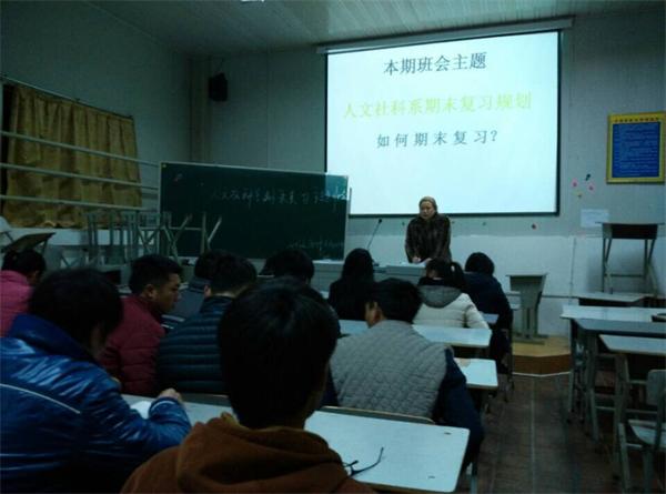 本次班会首先由各课代表分别总结各科的学习情况。班长总结这段时间学生学习的情况,从学习纪律,学习氛围等方面分析情况,进行期末总结。学习的目的,应试技巧,考试注意事项,同学们积极探讨。再结近尾声时,辅导员赋予殷切希望,同学们踊跃的表决自己的决心。