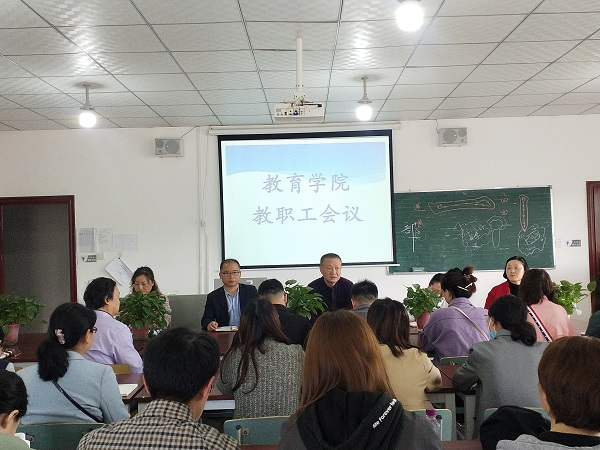 4月20日,教育学院在学前实训中心召开教职工会议,会议由院长吴节义主持,学院党总支书记熊定永、副院长孙红英及全体教职工参加了本次会议。