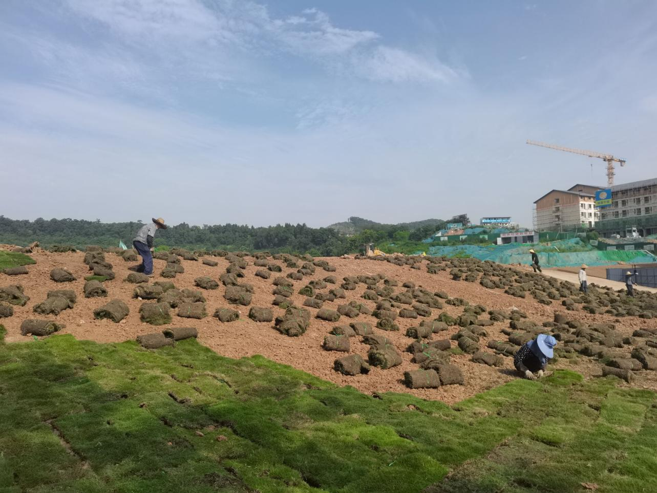 工作过程井然有序:施工前,通过对土壤贫瘠程度、板结程度及土壤的酸碱性进行分析,选择了适宜种植的花草树木;施工中,通过挖掘机进行挖坑及吊运移植工作,工人们负责覆土压实及平铺草皮,两者配合,有条不紊;施工后,对移植树木浇透水、施好肥,做好支撑工作,防止树木在根系扎稳之前偏倒。