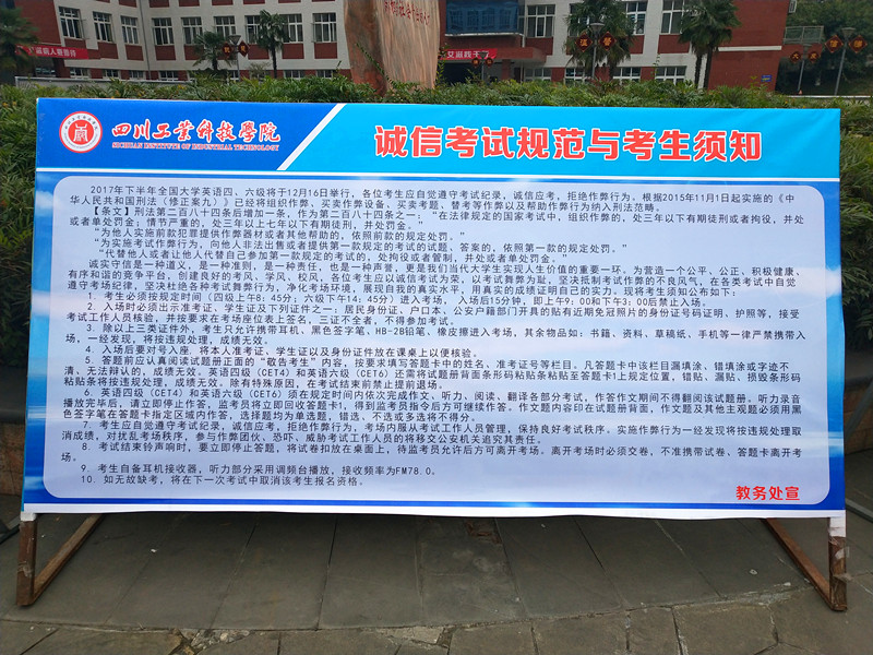 12月10日至15日,为进一步严肃考风考纪、净化考试环境,教育引导广大学生认真复习、积极备考,培养学生的诚信品德,营造公平、公正、诚实守信的考试氛围,在大学生英语四六级考试来临之际,教务处组织开展了内容丰富、形式多样的大学生英语四六级“诚信考试”系列教育活动。