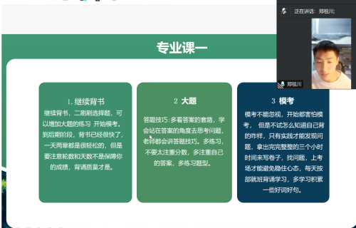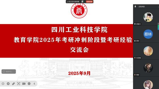 为精准助力学子高效备考,掌握冲刺阶段的关键技巧,提升考研成功率,教育学院于9月27日晚通过腾讯会议平台,举办考研冲刺阶段暨经验分享交流会。本次活动由颜富云老师主持,学院2025届全体考研学生及部分专业教师参与。