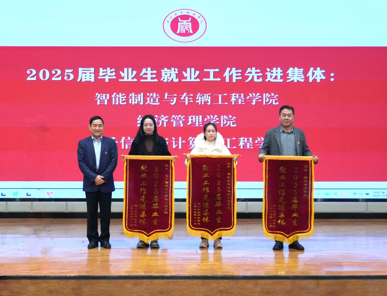 近日,四川工业科技学院2025届毕业生就业工作总结暨表彰大会在龑江C区报告厅举行。大会全面回顾了学校 2025 届毕业生就业工作成效,对在就业工作中表现突出的先进集体和个人进行了表彰。其中,智能制造与车辆工程学院凭借扎实的工作举措、优异的就业成效,获评“2025届毕业生就业工作先进集体”称号;蒋梦莹、郭亚茹等9位辅导员以高度的责任心和扎实的工作作风,荣获“2025 届毕业生就业工作先进个人”称号,为学院就业工作再添荣光。