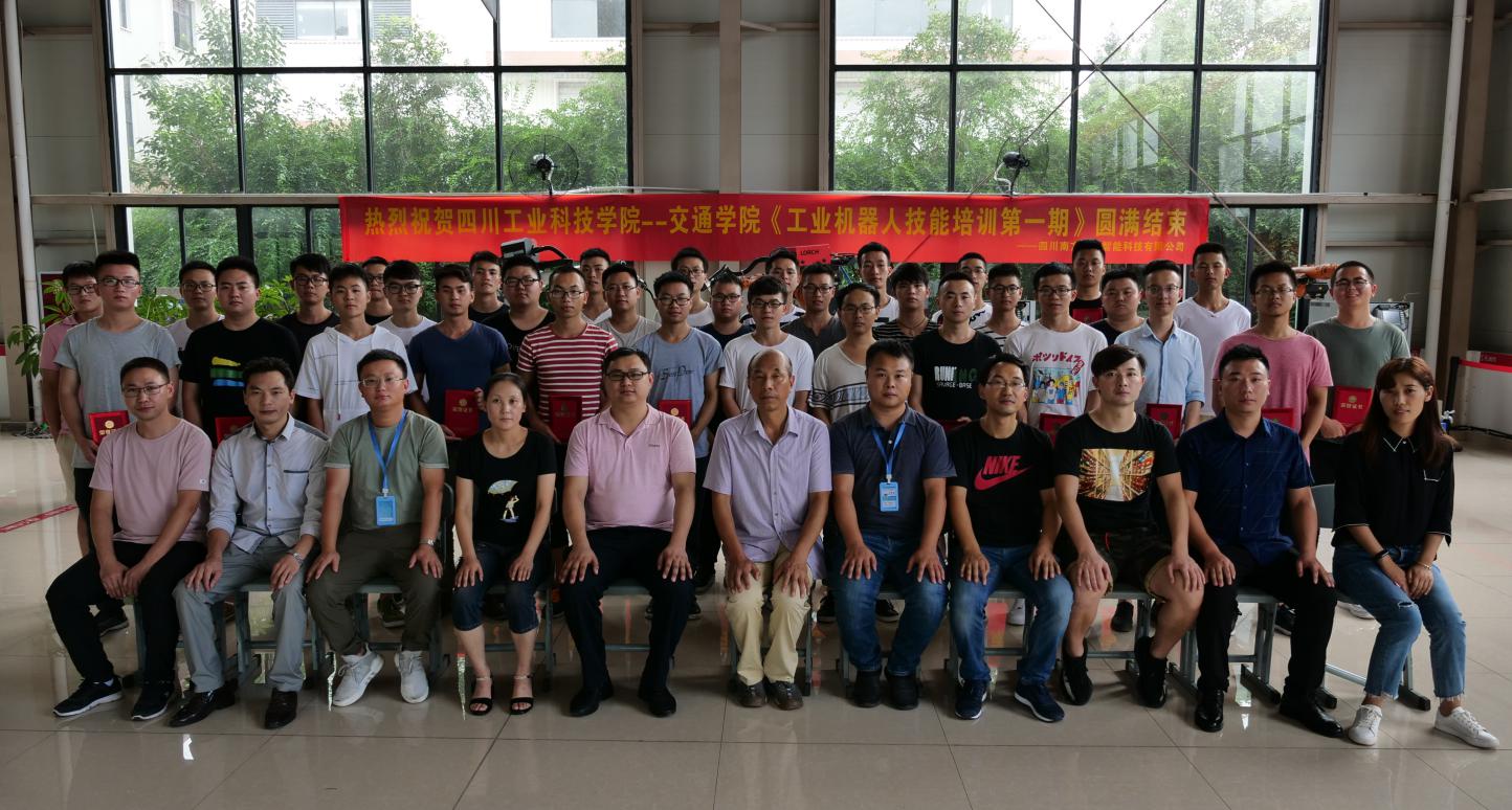 8月9日上午,交通学院携手四川南方集创智能科技有限公司,在学校汽车营销服务实训中心举办第一期“工业机器人技能培训”结业典礼。四川南方集创智能科技有限公司副总经理刘澜锟、总工程师王志刚、交通学院副院长徐纯厚、培训中心主任马志雪及第一期33名学员参加结业典礼。