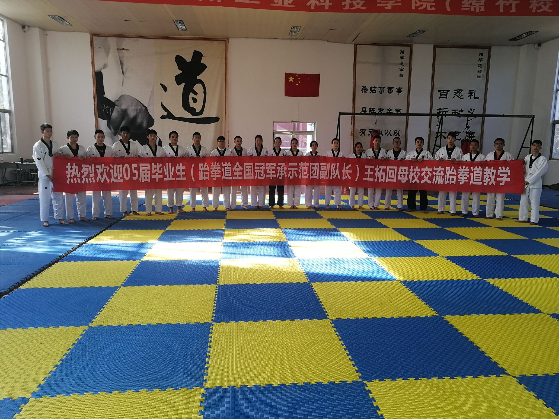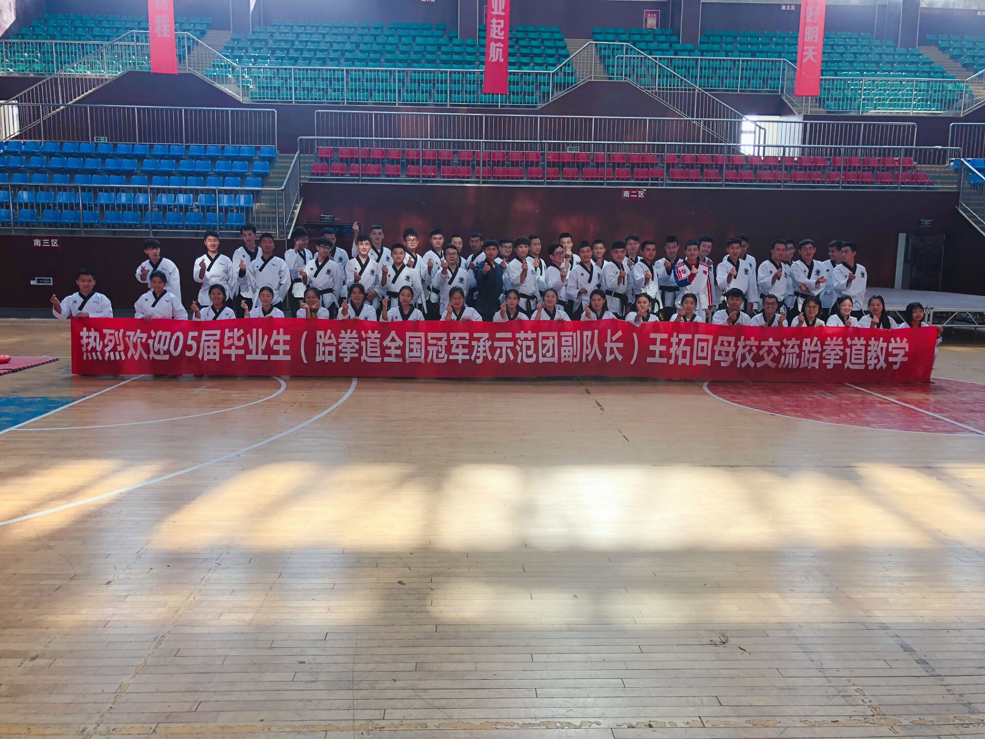 10月30日,我校05届毕业生、跆拳道全国冠军承示范团副团长王拓回母校交流跆拳道教学。体育学院院长雷耀方、党支部书记何忠国以及体育学院部分老师与王拓进行了交流。