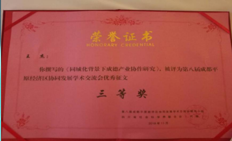 会议表彰了“第八届成都平原经济区协同发展交流会”优秀征文和组织工作先进集体,王杰老师的论文《同城化背景下成德产业协作研究》脱颖而出荣获三等奖,并编入《第八届成都平原经济区协同发展交流会论文集》,由四川大学出版社公开出版。