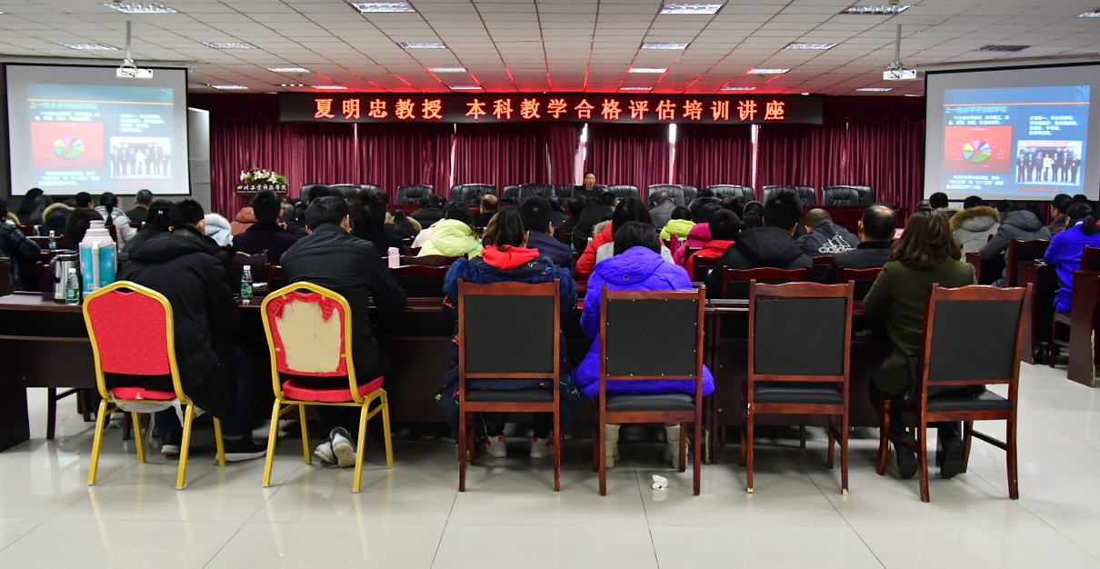 12月25日,中国“首届西部开发突出贡献奖”获得者,全国普通高等学校教学工作合格评估专家、教育部本科教学指导委员会专家,四川省首批学术技术带头人,四川省科技评议(审)委员会专家夏明忠博士受邀来我校开展本科教学合格评估培训讲座。全体校领导、副科级及以上干部参加了此次讲座。讲座由副校长郭桂萍主持。