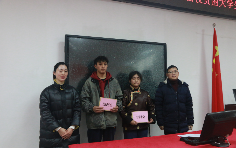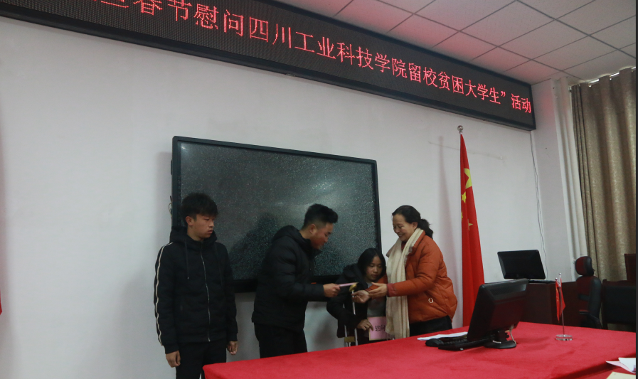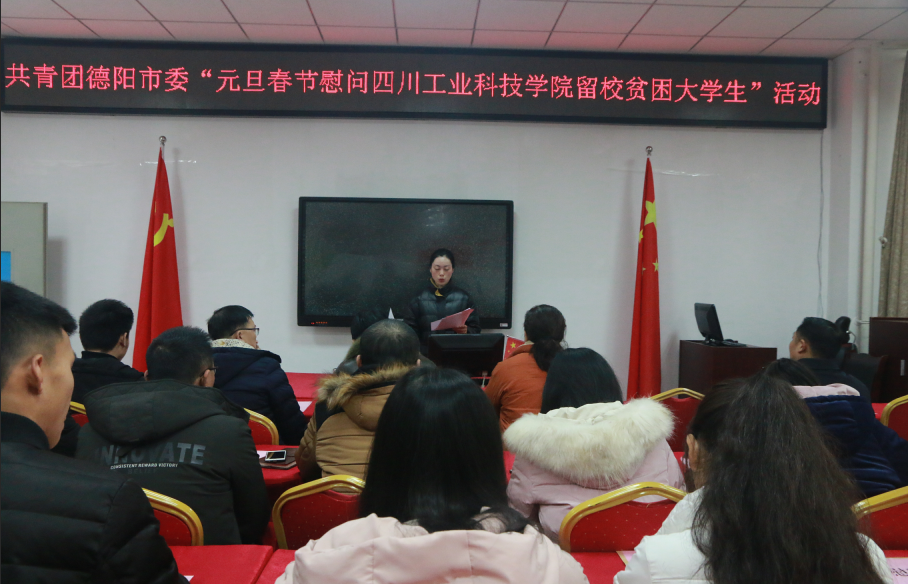 首先,校团委副书记王成鑫宣读了《共青团德阳市委关于2019年元旦、春节慰问留校贫困大学生的意见》。然后,学校党委副书记倪霞、学生工作部和校团委相关领导为10名留校贫困大学生发放了春节慰问金,送去了党和政府的温暖。受助学生代表张国婷做了热情洋溢的发言,衷心感谢党和政府的热情关怀,感谢学校的爱心传递和悉心培养教育,要将这份关怀和温暖转化为潜心学习的动力,以优异的成绩回馈党和政府,回馈国家和人民。