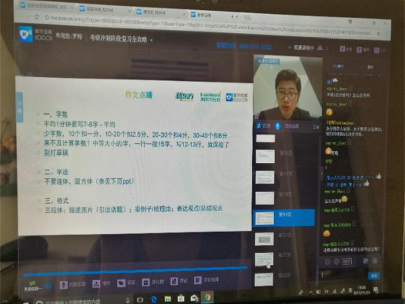 此次培训是基础部英语分部向新东方相关负责人联系并申请的直播课程,旨在助推同学们的考研梦。课程从心态、复习、生活和提分四个模块入手,对冲刺路上的障碍逐一分析、扫除;同时,吴博衍老师还亲授了他复习中的几个诀窍,以及考试中那些不得不知的秘闻。参加培训的同学认真聆听、积极思考,并耐心做好笔记。