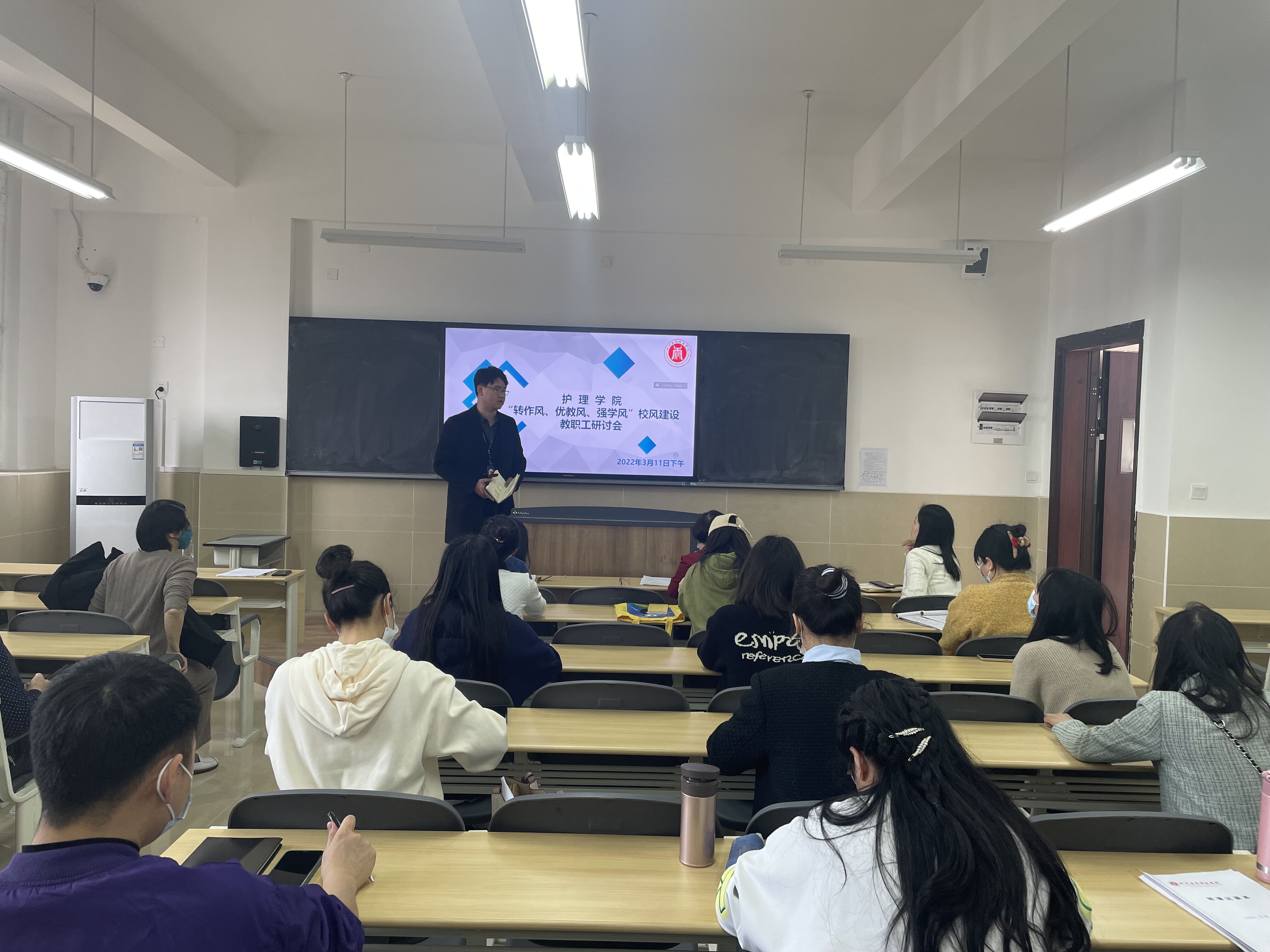 为进一步规范教学过程,提升教学质量。2022年3月11日下午,在10教511教室护理学院全体教职工召开“转作风、优教风、强学风”建设研讨会,会议由护理学院书记李双晶主持,护理学院全体教职工参加会议。本次会议以“‘三风’建设教职工研讨会”为主题,分为李双晶书记讲话和全体教职工研讨两个部分。
