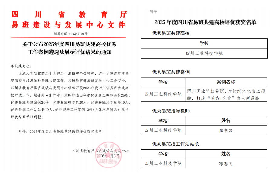 近日,四川省教育厅易班建设与发展中心公布2025年度四川易班共建高校优秀工作案例遴选及展示评优结果,学校荣获优秀易班共建高校,《四川工业科技学院:为传统文化插上翅膀,打造“网络+文化”育人新通路》荣获优秀易班共建案例,党委宣传部崔书磊老师荣获优秀易班指导教师,易班学生工作站站长邓赛飞荣获优秀易班工作站站长,其中优秀易班共建案例、优秀易班工作站站长成功推荐全国评优,充分彰显了我校易班建设工作的扎实成效与特色优势。