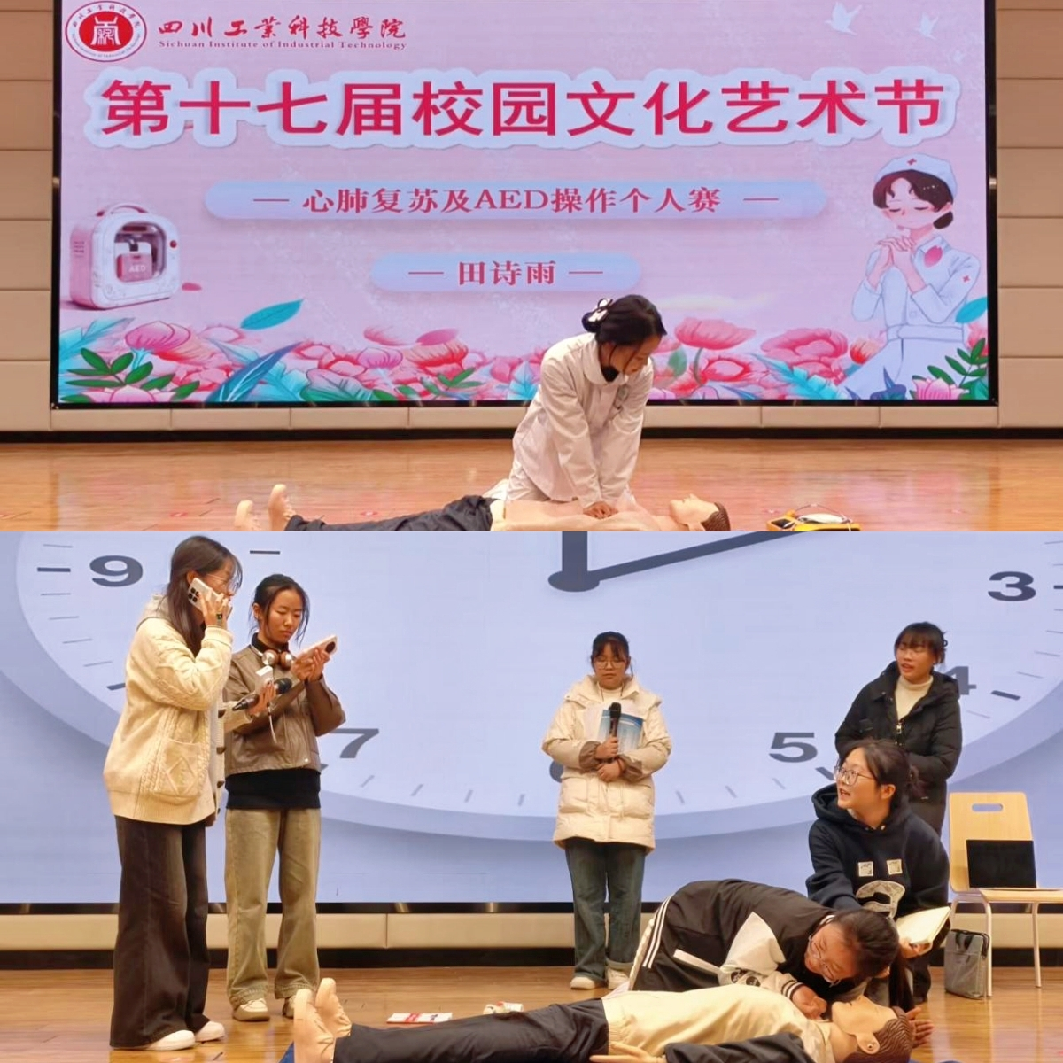大健康学院将专业技能与艺术表达深度结合,举办AED操作展示、AED情景剧表演、爱国主义主题演讲及乐器类比赛。AED技能赛场上,选手们规范完成急救全流程操作,彰显专业素养;情景剧以真实紧急场景为蓝本,将急救技能融入剧情,强化安全防护意识;演讲与乐器表演则兼顾思想性与艺术性,用声音传递家国情怀与青春力量。